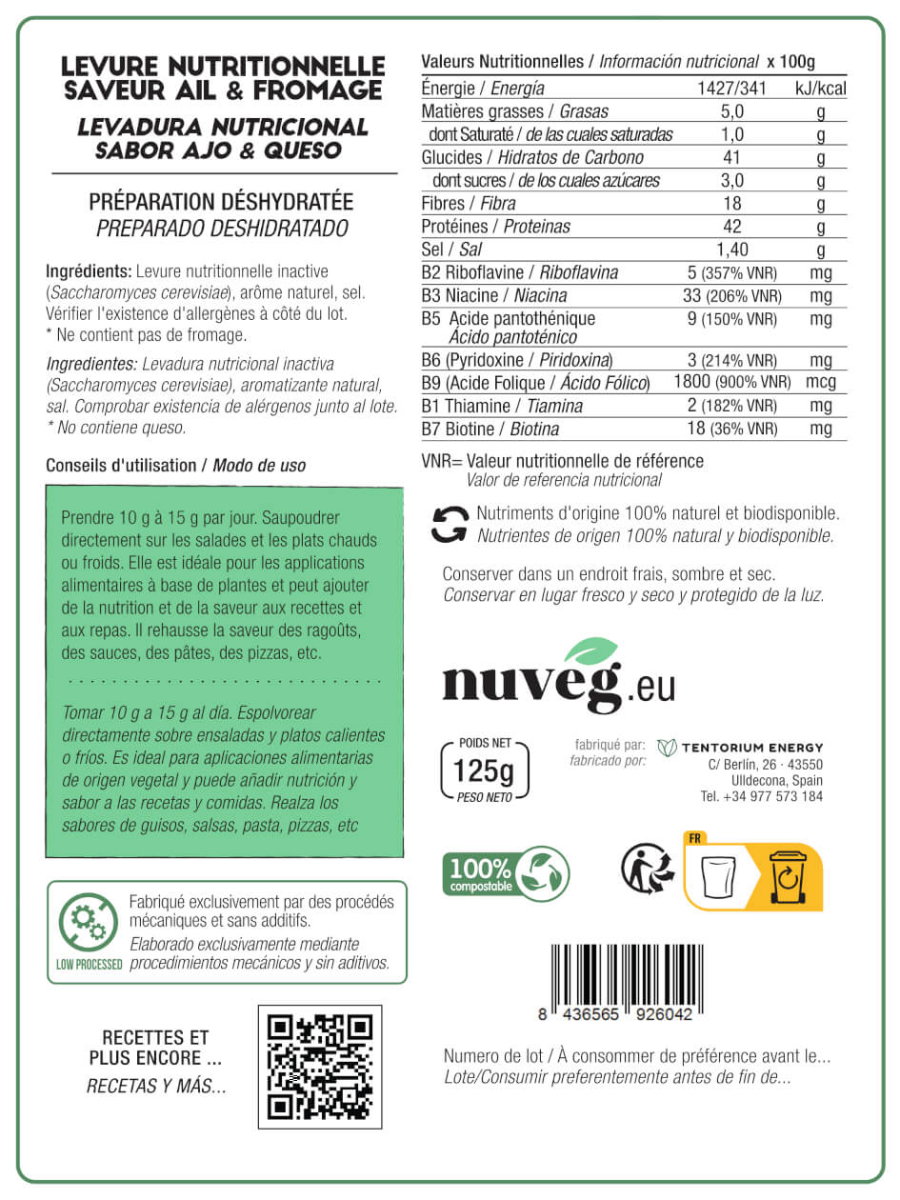 Principales Ventajas Delicioso sabor Ajo-Parmesano Gran versatilidad de uso, tanto en preparaciones crudas como cocidas Muy bajo índice glucémico Fuente de proteínas 43% Fuente de vitaminas del grupo B La vitamina B6 ayuda a regular la actividad hormonal. El ácido pantoténico contribuye al rendimiento intelectual normal. La riboflavina contribuye al mantenimiento de la visión en condiciones normales. La vitamina B6 contribuye al funcionamiento normal del sistema inmunitario. Fuente de fibra Libre de gluten Indicada para vegetarianos y veganos Libre de tóxicos, sometida a rigurosos controles de calidad Valoración La Levadura Nutricional Ajo Parmesano de Nuveg es una fuente de proteínas, fibra dietética y vitaminas B. Puede consumirse directamente, utilizarse en recetas o espolvorearse sobre los alimentos y en las bebidas para obtener una mayor nutrición y realzar el sabor a ajo-parmesano. Una porción típica sería de 10-15 g.