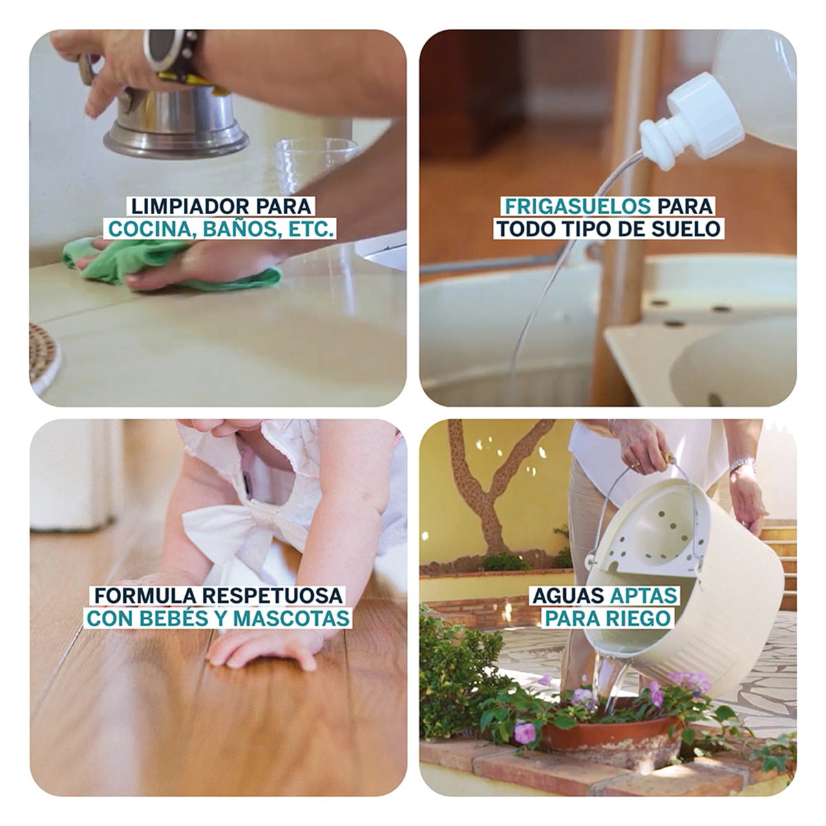 Eficaz y potente limpiador para todo tipo de superficies: suelos, muebles de cocina y baño, sanitarios, baldosas, azulejos y cualquier superficie lavable del hogar.