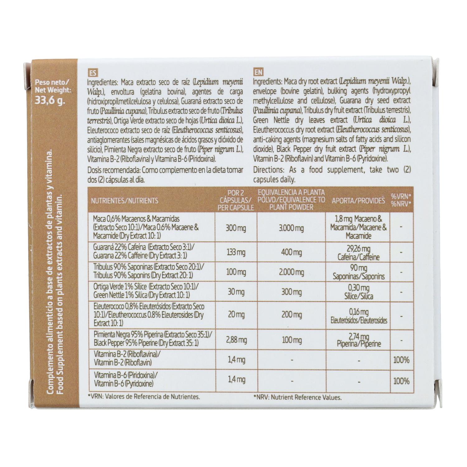 Extracto de Maca 150 mg, Agente de carga (hidroxipropilmetilcelulosa y celulosa vegetal), Guaraná extracto seco 66,5 mg, Tribulus extracto seco 50gr, Ortiga Verde extracto seco 15 mg, Eleuterococo extracto seco 10 mg, Antiaglomerante (Estearato de magnesio vegetal y dióxido de silicio), Pimienta negra extracto seco 1,44 mg, Vitamina B2 0,7 mg, Vitamina B6 0,7 mg, Envoltura (gelatina