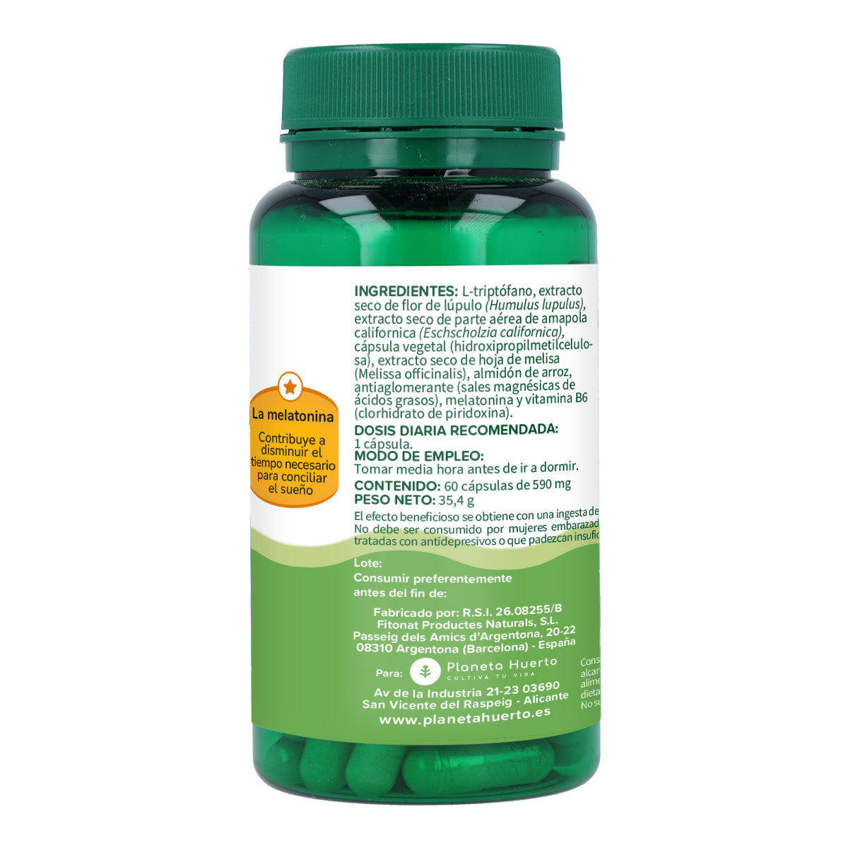 Melatonina Complex de Planeta Huerto es un suplemento alimenticio en cápsulas que combina melatonina con ingredientes naturales como el L-triptófano, lúpulo, amapola californiana, melisa y vitamina B6. Este producto está diseñado para facilitar el sueño de manera natural, ayudando a reducir el tiempo necesario para dormirse. Es ideal para personas con insomnio ocasional o con dificultades para conciliar el sueño debido al estrés, cambios de horario o jet lag.