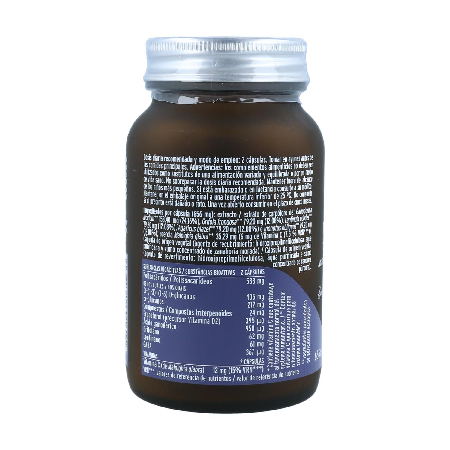 Ingredientes por cápsula (656mg): extracto / de carpófora de: Ganoderma lucidum** 158.40 mg (24.16%), Grifola frondosa** 79.20mg (12.08%), Lentinula edodes** 79.20mg (12.08%), Agaricus blazei** 79.20mg (12.08%) e Inontus obliquus ** 79.20mg (12.08%); acerola Malpighia glabra** 35.29 (6mg de Vitamina C (7,5% VRN**)). Cápsula de origen vegetal (agente de recubrimiento: hidroxipropilmetilcelulosa, agua purificada y zumo concentrado de zanahoria morada) / Cápsula de origen vegetal (agente de revestimento: hidroxipropilmetilcelulosa, água purificada e sumo concentrado de cenoura púrpura).