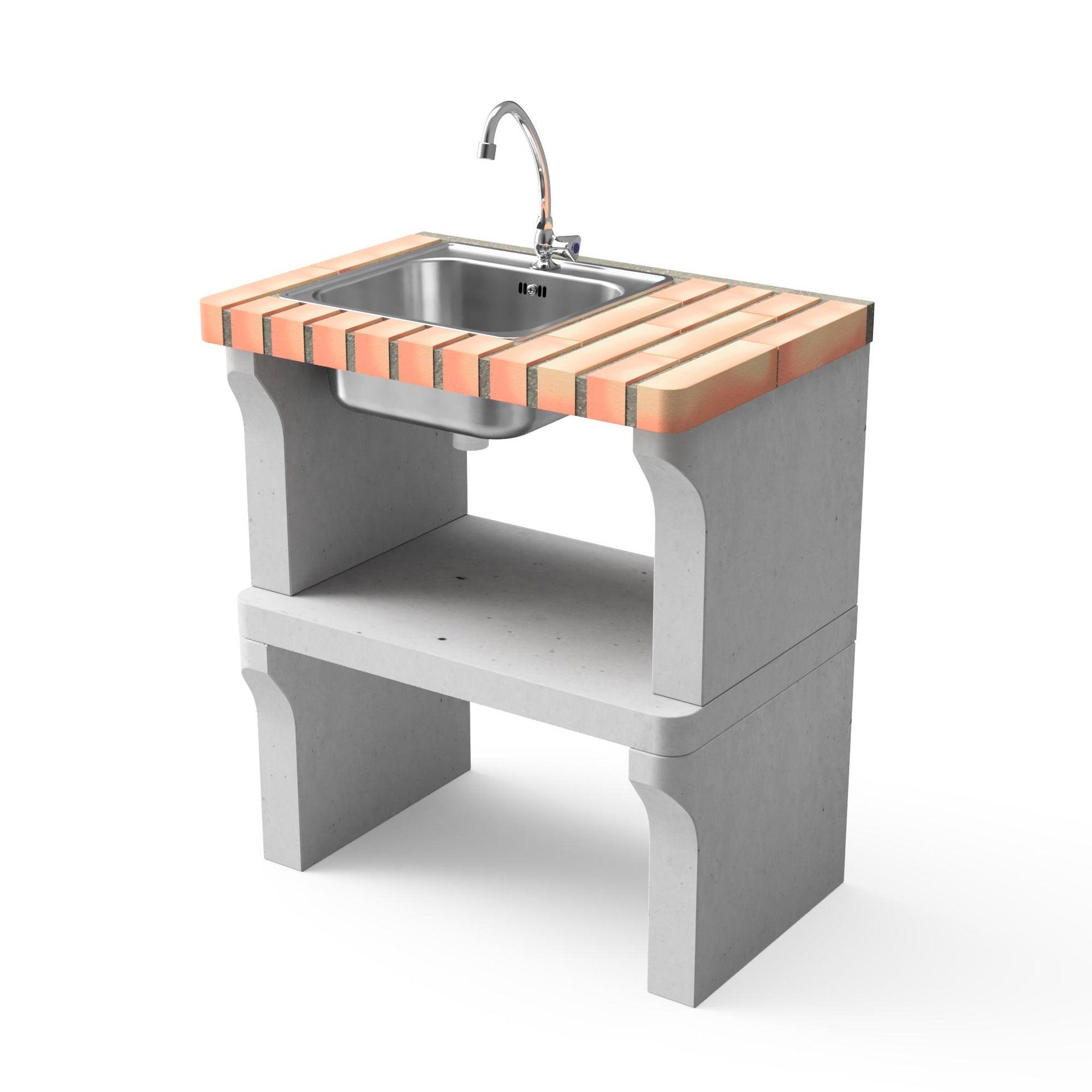 Módulo de hormigón gris refractario y ladrillo naranja claro. Fregadero de acero inoxidable y grifo cromado.