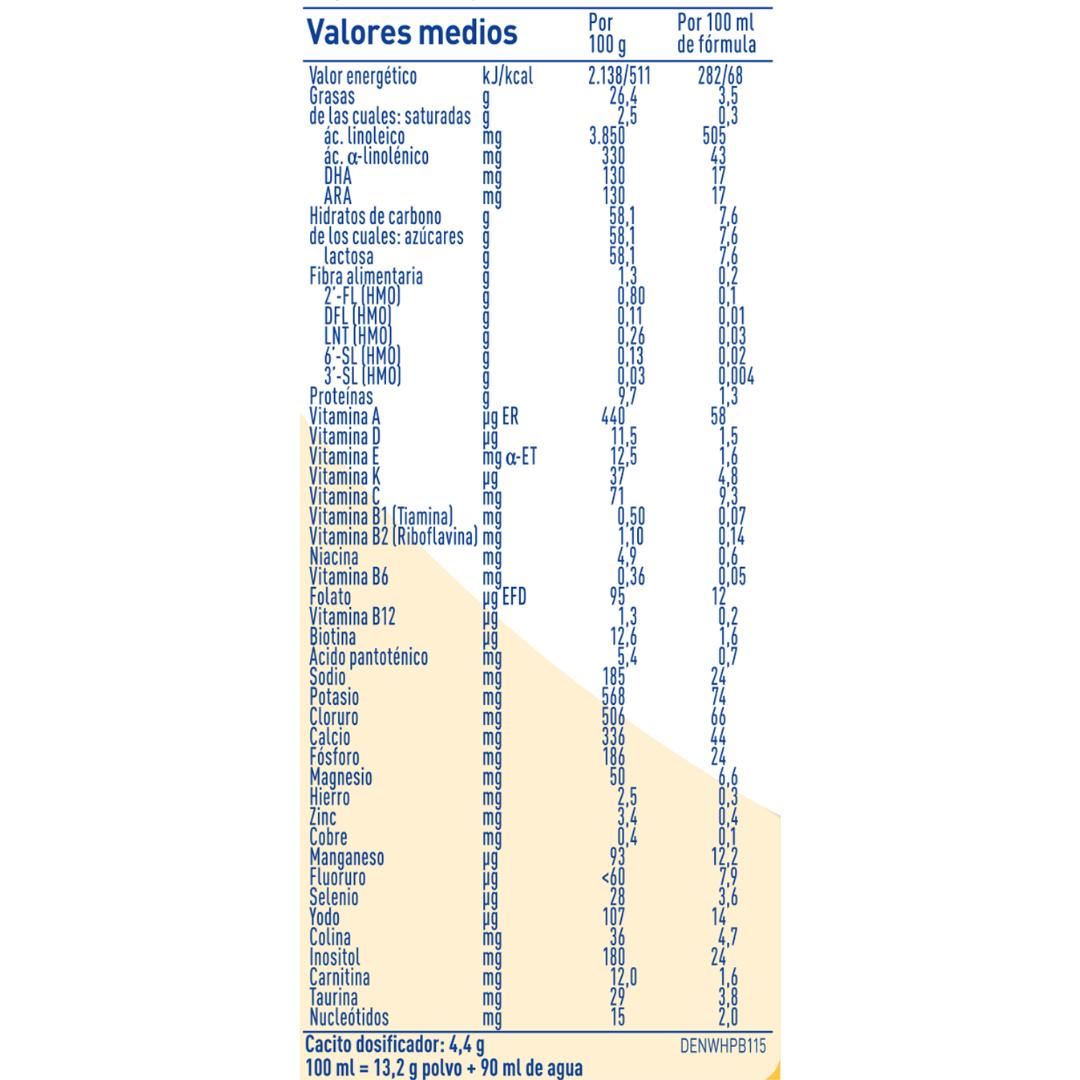Lactosa, aceites vegetales (girasol, coco, nabina y de Mortierella alpina rico en ARA), proteínas hidrolizadas enzimáticamente* de suero de leche, sales minerales (fosfato cálcico, cloruro de magnesio, cloruro potásico, fosfato potásico, cloruro sódico, sulfato ferroso, sulfato de zinc, sulfato cúprico, sulfato de manganeso, yoduro potásico y seleniato sódico), 2'-O-fucosil-lactosa (2'-FL), lacto-N-neotetraosa (LNnT), aceite de pescado, L-arginina, L-histidina, dextrinomaltosa, colina, L-tirosina, vitaminas (L-ascorbato sódico, DL-alfa acetato de tocoferol, acetato de retinol, nicotinamida, D-pantotenato cálcico, colecalciferol, mononitrato de tiamina, riboflavina, clorhidrato de piridoxina, filoquinona, ácido fólico, D-biotina y cianocobalamina), taurina, inositol, L-carnitina, nucleótidos (citidina, uridina, adenosina y guanosina) y fermentos lácticos [cultivos de Lactobacillus reuteri (DSM 17938**)].