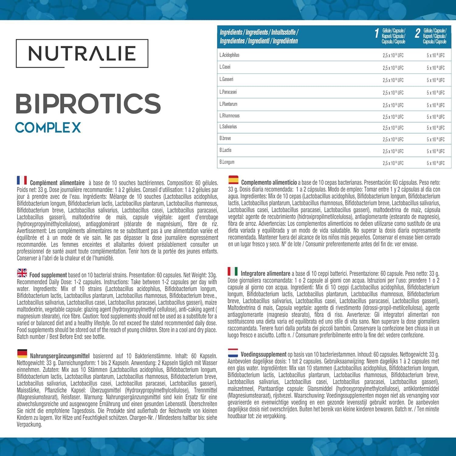 BiproticsComplex Nutralie 60 caps.de Nutralie es un complemento alimenticio natural con una combinación de 10 cepas, que se complementan entre ellas. Esta combinación proporciona 50 mil millones de UFC garantizadas durante la vida útil del producto.