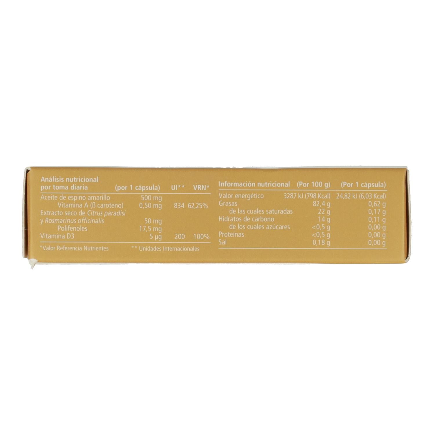 Aceite de espino Amarillo (Hippophoe rhamnoides) 500 mg, cápsula (Hydroxypropyl methyl celulosa), extracto seco de pomelo (Citrus paradise) (fruto) y Romero (Rosmarinus officinalis) (hojas) (minimo 35% polifenoles 17,5 mcg) (50 mg), antiaglomerante (dióxido de silicio), vitamin D3 (Colecalciferol).