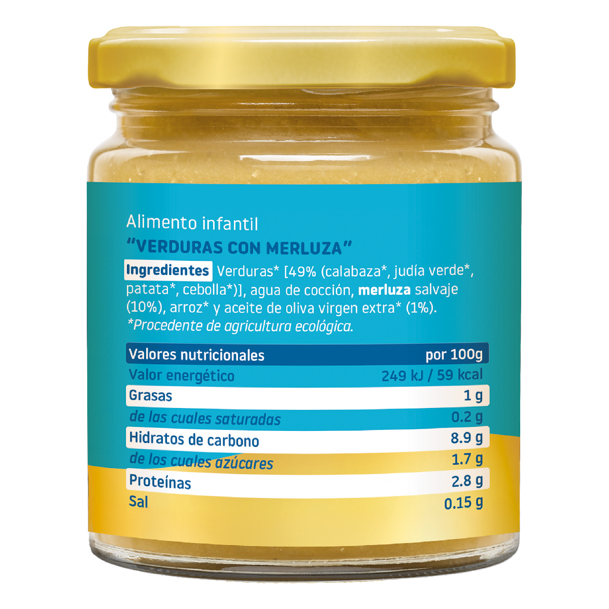 - Verduras* [49% (calabaza*, judía verde*, patata*, cebolla*)], agua de cocción, merluza salvaje (10%), arroz* y aceite de oliva virgen extra* (1%). *Procedente de agricultura ecológica.