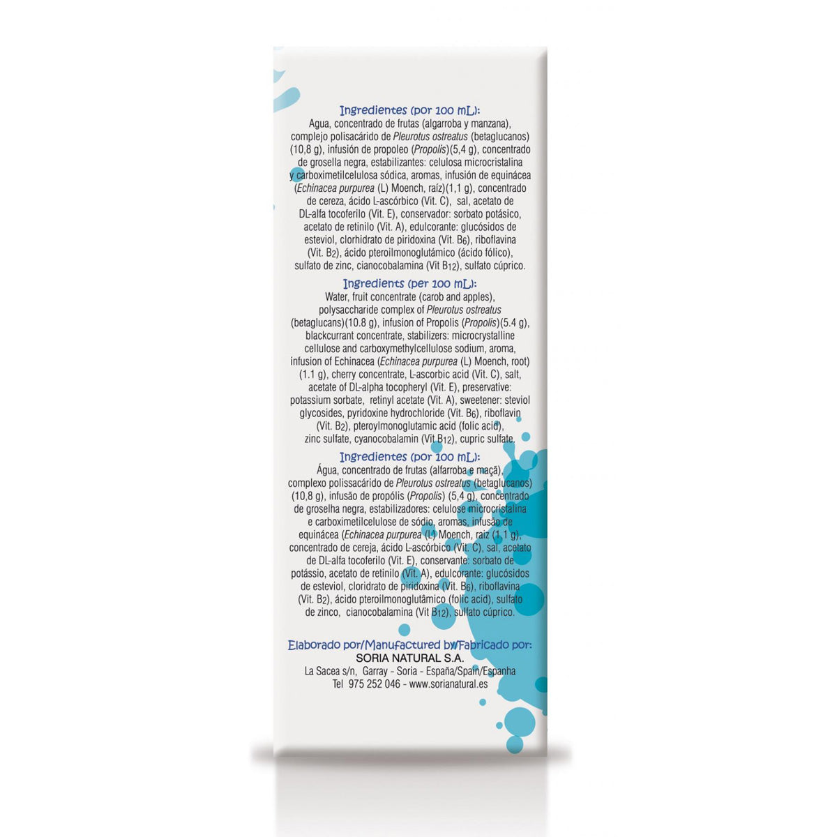 Ingredientes: Agua, concentrado de frutas, extracto concentrado de Pleurotus ostreatus, propóleo, equinácea, concentrado de grosella, concentrado de cereza, aroma de frambuesa, zinc, vitamina A, vitamina E, cobre, vitamina B6, vitamina B2, ácido fólico, vitamina B12, ácido L-ascórbico (vitamina C), celulosa (estabilizador), sorbato potásico (conservante), sal, sucralosa (edulcorante).
