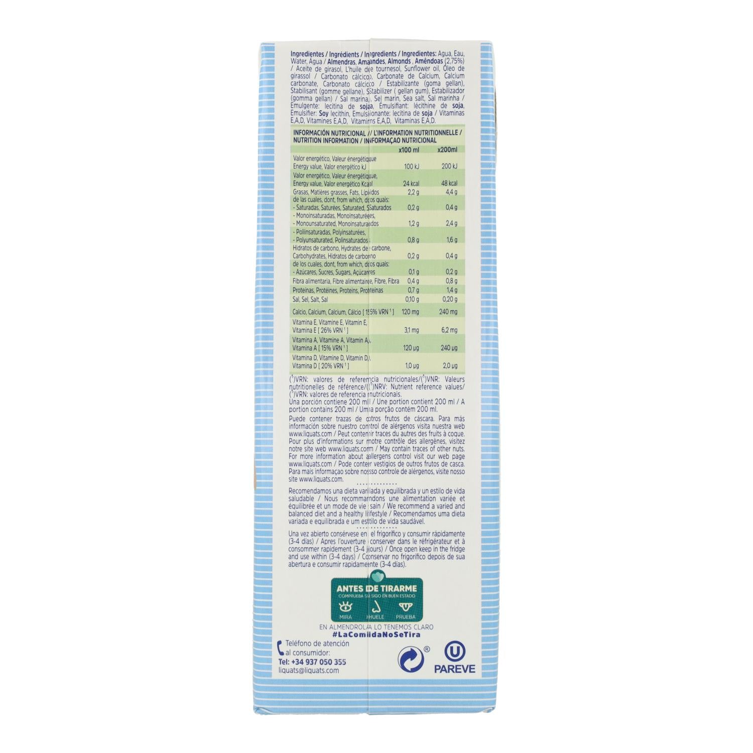 Ingredientes: Agua del Montseny, almendra (2,75%), aceite de girasol, carbonato cálcico, goma gellan, emulgente: lecitina de girasol, sal marina, vitaminas A, D y E. Alérgenos: Almendra, puede contener trazas de soja y/o de otros frutos de cáscara