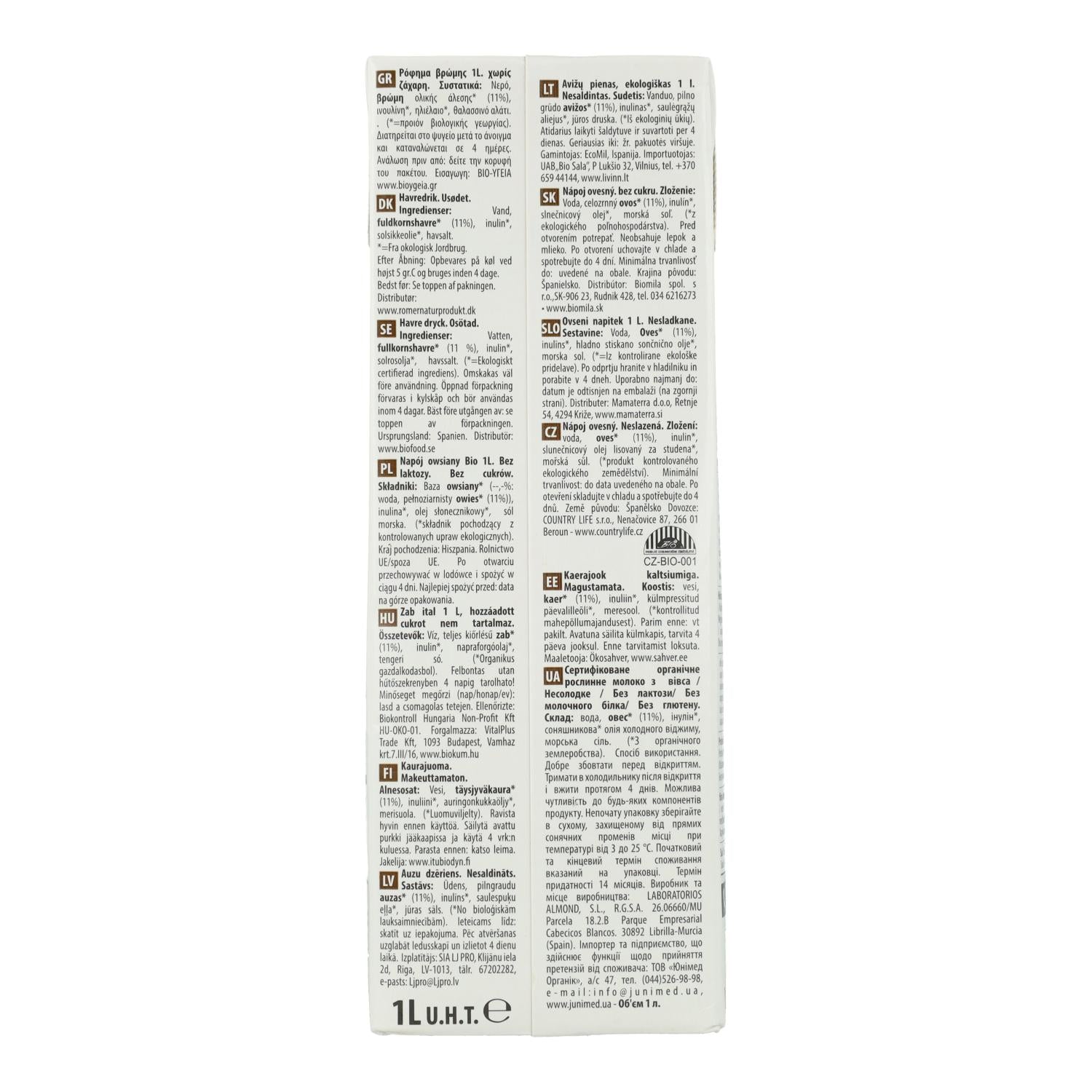 Ingredientes: Agua, avena integral* (11%), inulina*, aceite de girasol prensado en frío*, sal marina. *Ingredientes procedentes de la Agricultura Ecológica.