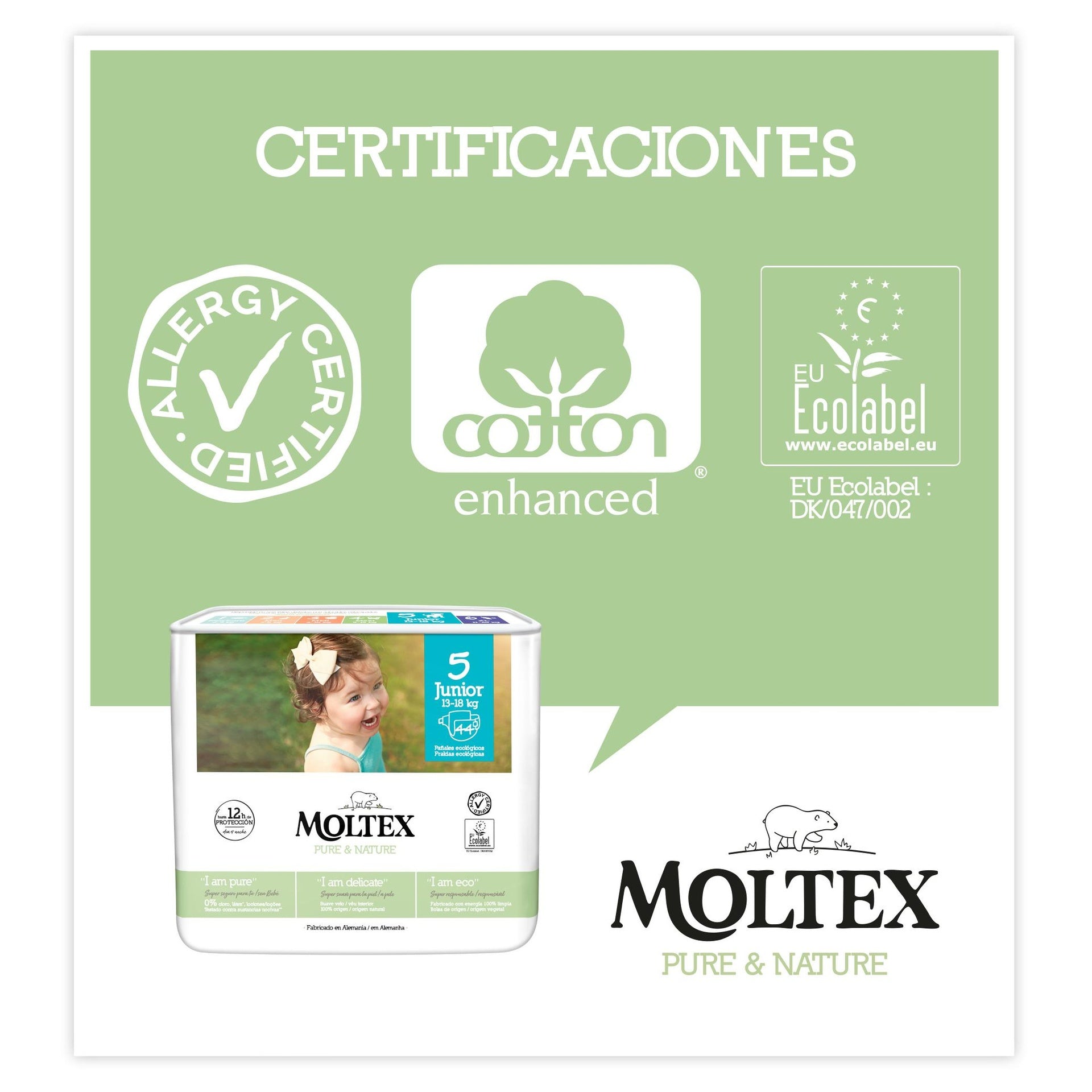Todos estos beneficios están testados y certificados por organismos independientes con sellos de calidad internacional. Moltex Pure & Nature es el pañal más seguro para tu bebé y el planeta.