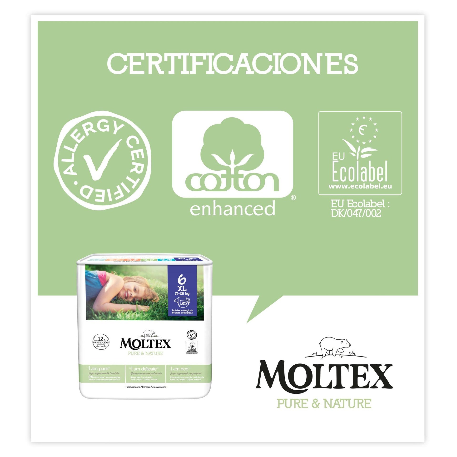 Toda la información sobre "Pañales Moltex Pure & Nature T6 (17-28 kg), 35 Uds"
