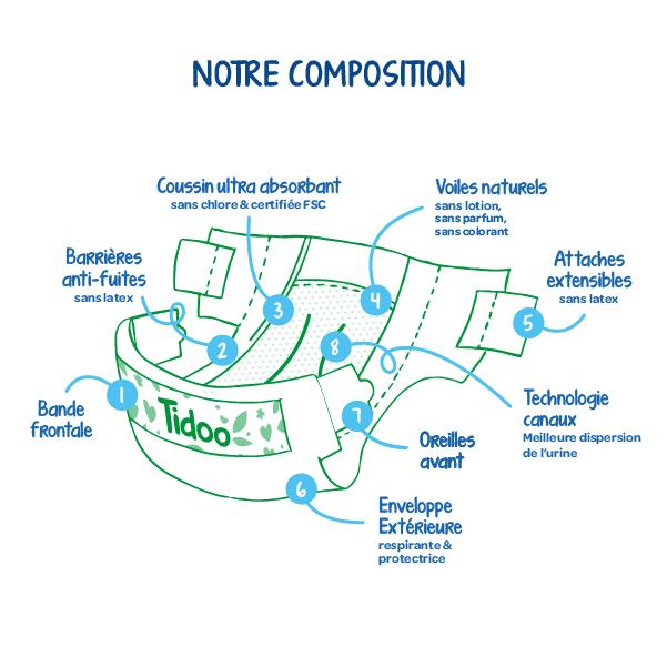 Bebés sanos: en Tidoo, las palabras "irritación o sustancias nocivas" nos aceleran el corazón. Por eso hemos desarrollado pañales naturalmente sanos para proteger a las generaciones futuras con : - Contacto con la piel 100% natural - Testados contra más de 200 sustancias controvertidas - 0% perfume, loción, petrolato - Blanqueamiento sin cloro - 12 horas de eficacia antifugas para limitar la aparición de irritaciones, gracias a la nueva tecnología de canales para una mejor absorción - un indicador de humedad que cambia de color al contacto con la orina