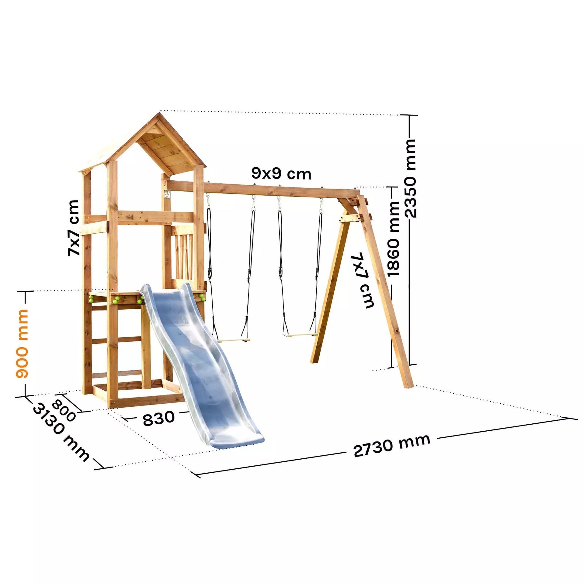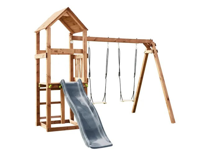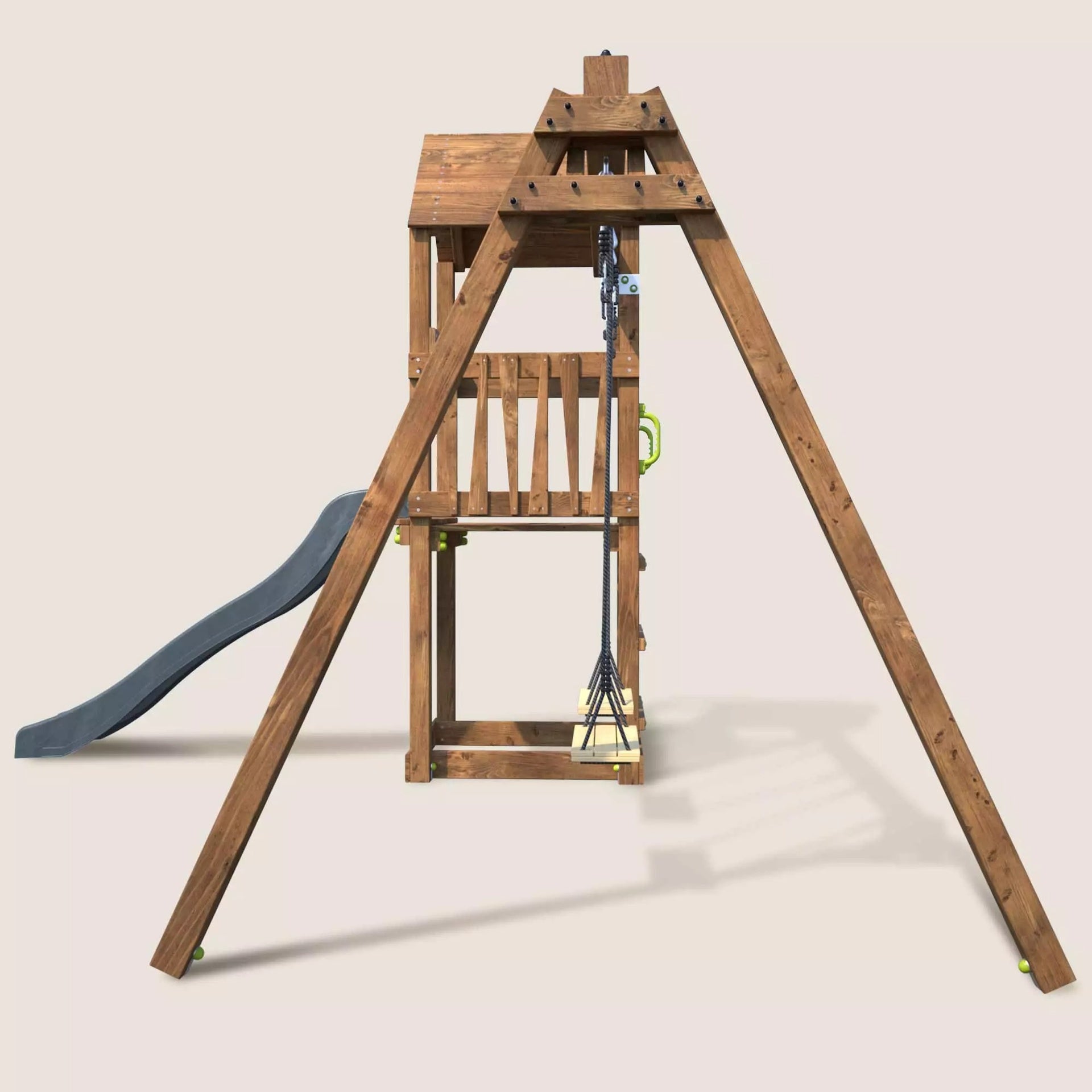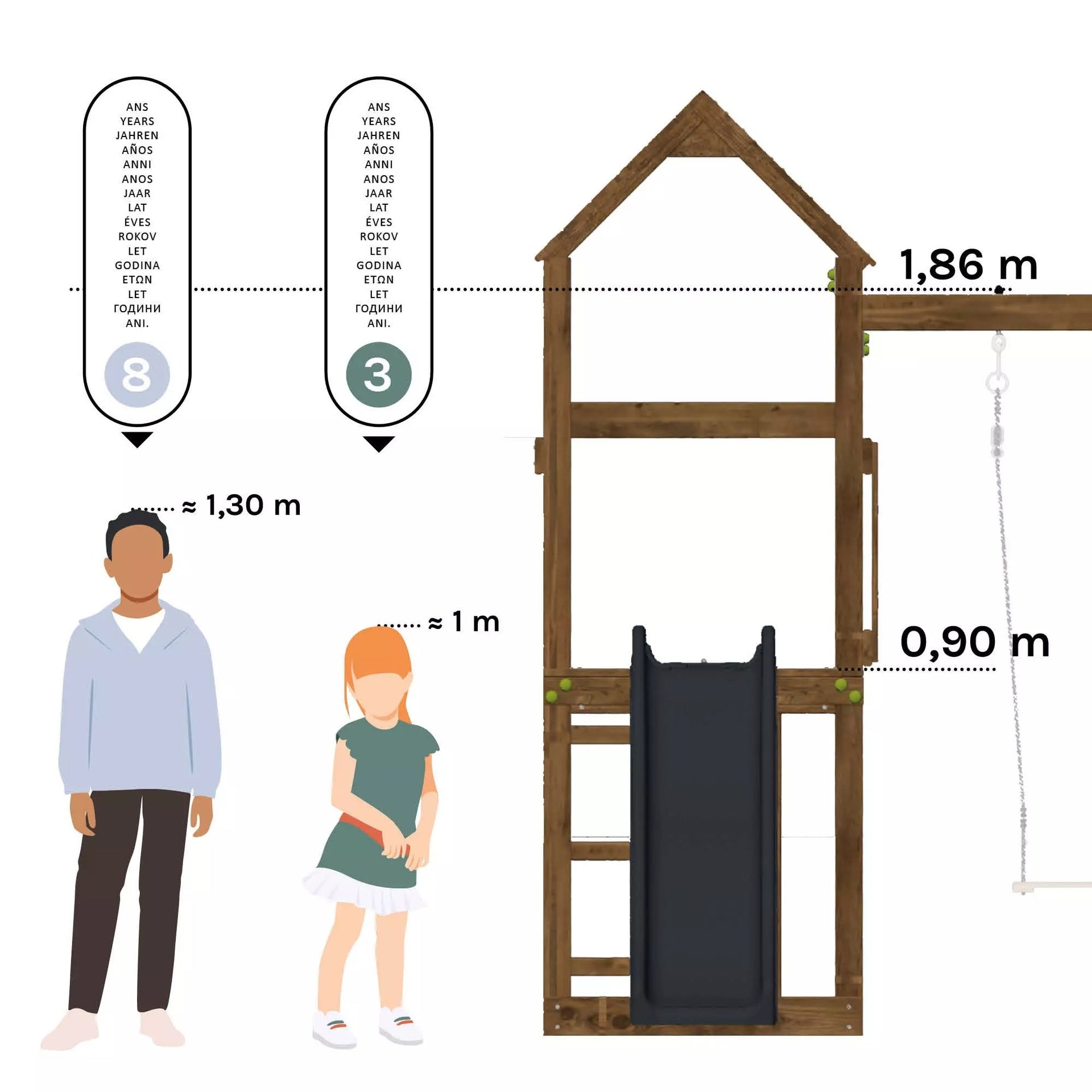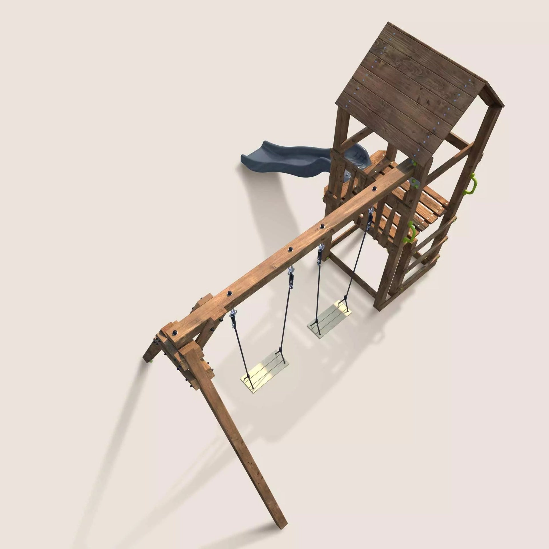 Este parque infantil está equipado con dos columpios de madera con cuerdas ajustables, que se pueden instalar rápida y fácilmente mediante ganchos en la viga preperforada.