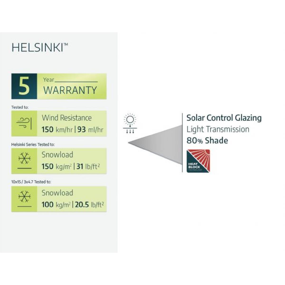 - Resistencia Climática Todo el Año: Resistente al viento, la nieve y el granizo. Probada para soportar vientos de hasta 93 mph / 150 km/h y cargas de nieve de hasta 31 lb./ft² / 150 kg/m².