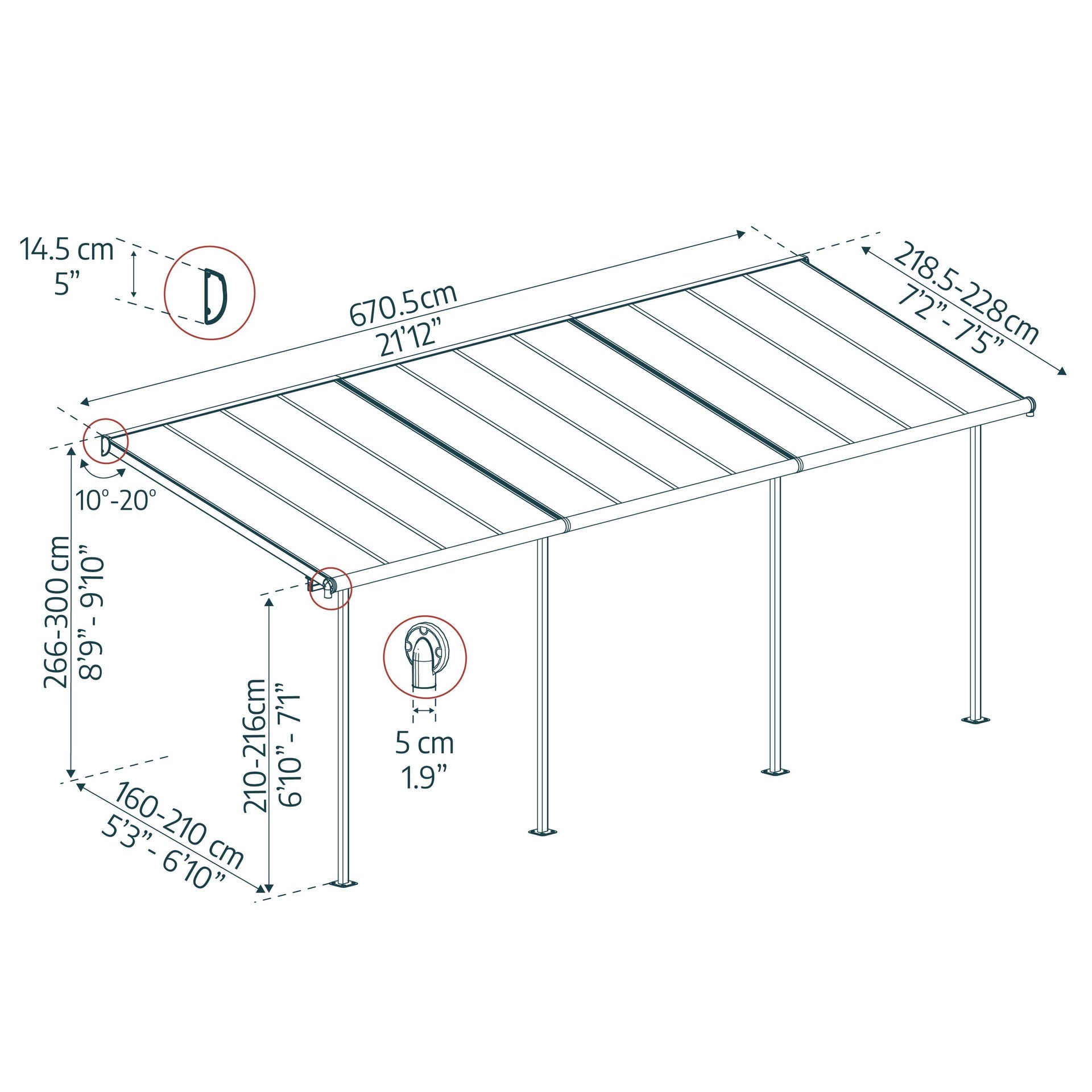 Sierra es una potente estructura de posicionamiento flexible que permite fijar la altura deseada en la conexión con la pared, la distancia a la casa y entre los postes ovalados de la parte delantera. Ha sido diseñado para ser montado fácilmente por 2 personas, con el sistema de paneles deslizantes que garantiza un montaje seguro y fácil; no requiere experiencia, ni habilidades especiales, ni herramientas especiales. Sierra proporcionará a su familia un espacio de vida exterior elegante, robusto y libre de óxido durante años.