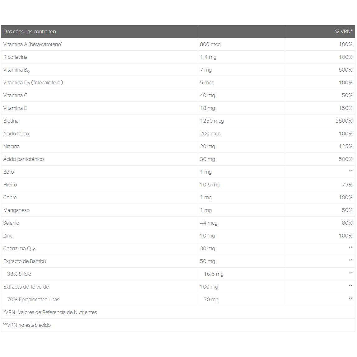 - Soporte nutricional para el mantenimiento en condiciones normales de piel, cabello y uñas.