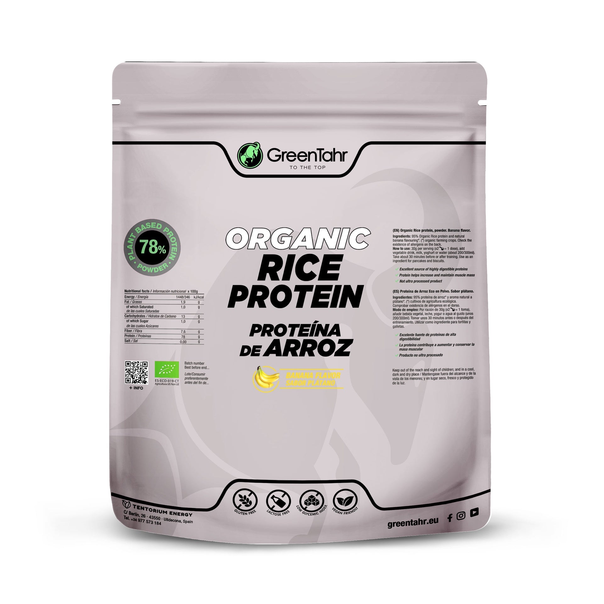 La proteína de arroz ecológica sabor banana de Green Tahr es una buena fuente de proteína dietética vegana de fácil digestión, adecuada para prácticamente cualquier tipo de consumidor ya que puede ser ingerida por personas con alergias o intolerancias al trigo, leche, huevo y la soja. Por su proceso de elaboración respetuoso y ecológico, no contiene productos químicos ni ningún tipo de aditivo artificial.