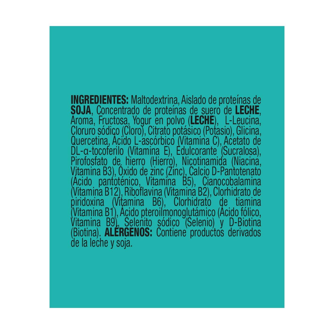 Maltodextrina, Aislado de proteínas de soja, Concentrado de proteínas de suero de leche obtenido por ultrafiltración, Fructosa, L-Leucina, Aroma, Cloruro sódico, Citrato potásico, Glicina, Quercetina, Vitamina C (Ác. L-ascórbico), Vit. E (Alfa Tocoferol), Edulcorante: Sucralosa, Vit.B3 (Niacina), Zinc, Hierro, Vit.B5 (Ác. Pantoténico), Vitamina B6 (Piridoxina), Vitamina B2 (Riboflavina), Vitamina B1 (Tiamina), Vitamina B9 (Ác. Fólico), Biotina, Selenio, Vitamina B12 (Cianocobalamina).