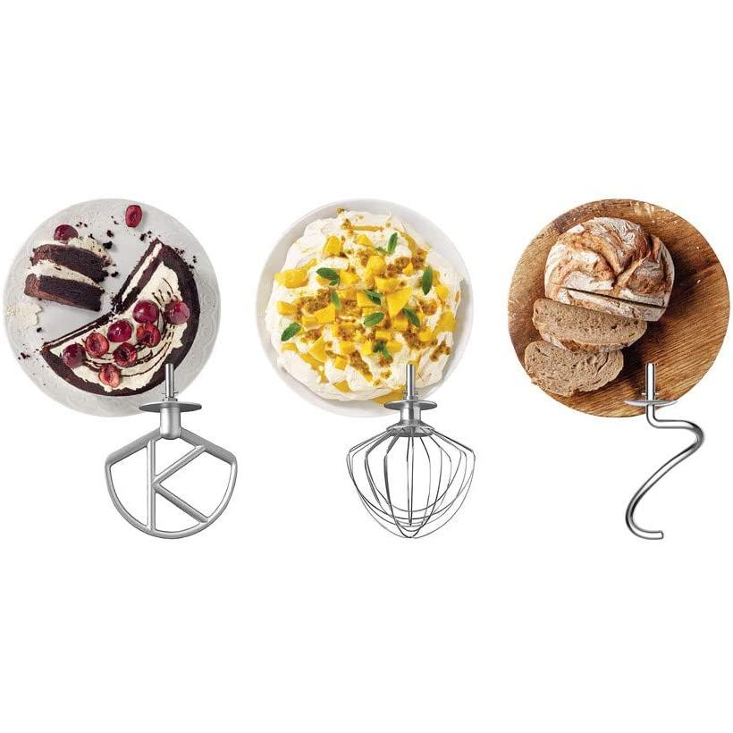 - Para batir y amasar: incluye un gancho de amasar, varillas para batir y mezclador con forma K para realizar cualquier receta de pastelería o panadería