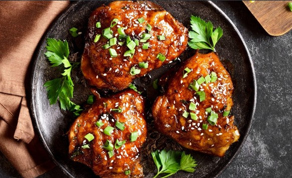 - Sirve el pollo y decora con cebolla de verdeo y semillas de sésamo.