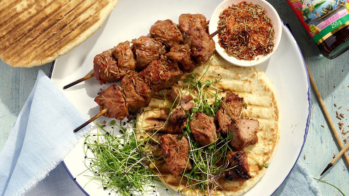 - Ensarta los cubos de cordero en brochetas. Si usas brochetas de madera, remójalas en agua durante 30 minutos y protege los extremos con papel de aluminio cuando estén ensambladas.