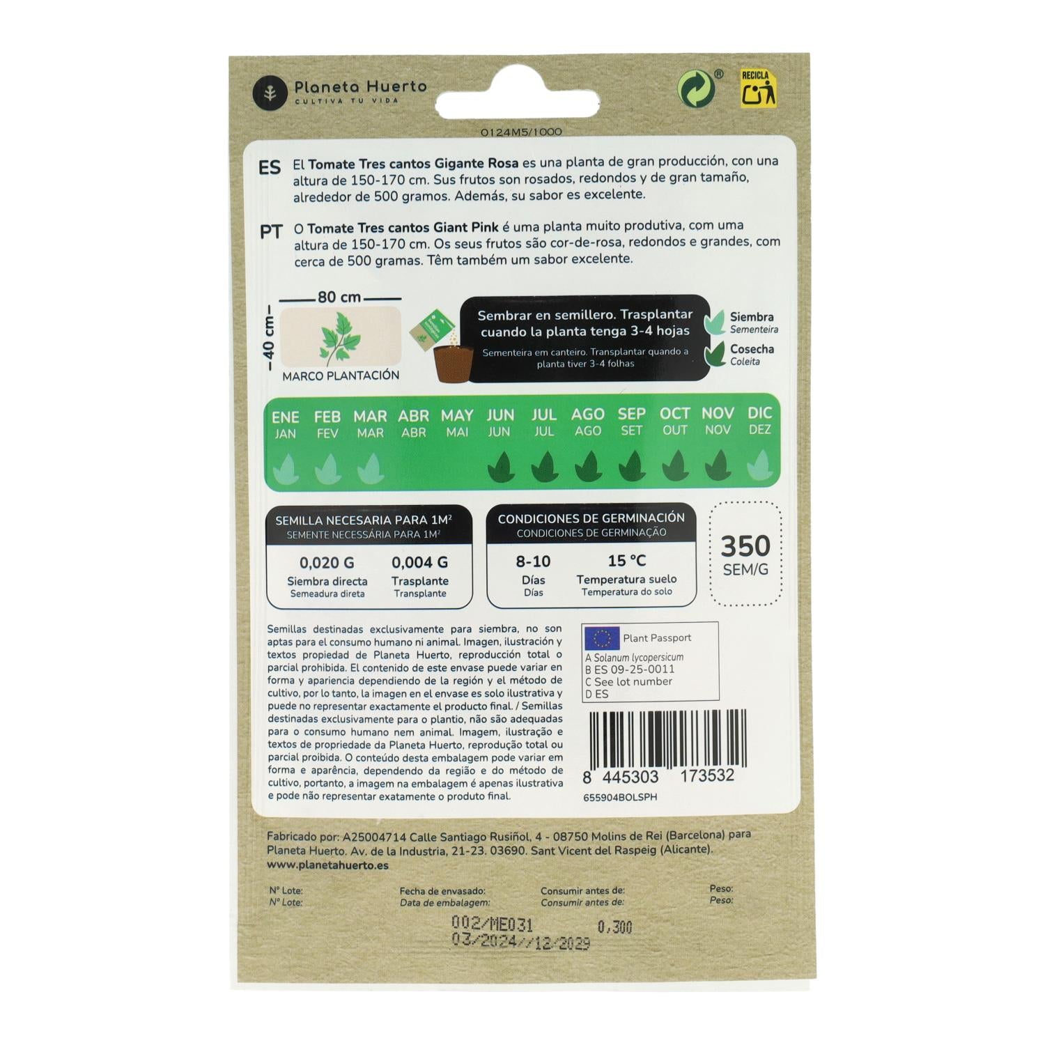 Toda la información sobre "Semillas de Tomate tres cantos gigante rosa ecológicas Planeta Huerto"