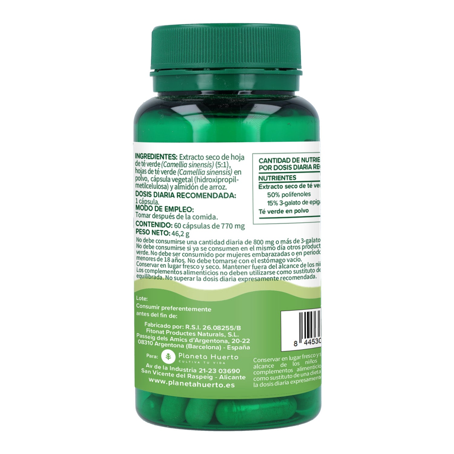El Té Verde de Planeta Huerto es un suplemento alimenticio elaborado con extracto seco de hoja de té verde (Camellia sinensis) estandarizado al 50% en polifenoles y 15% en galato de epigalocatequina (EGCG), junto con hojas de té verde en polvo. Este complemento es ideal para quienes buscan aprovechar los beneficios antioxidantes del té verde, así como su efecto estimulante y termogénico natural.