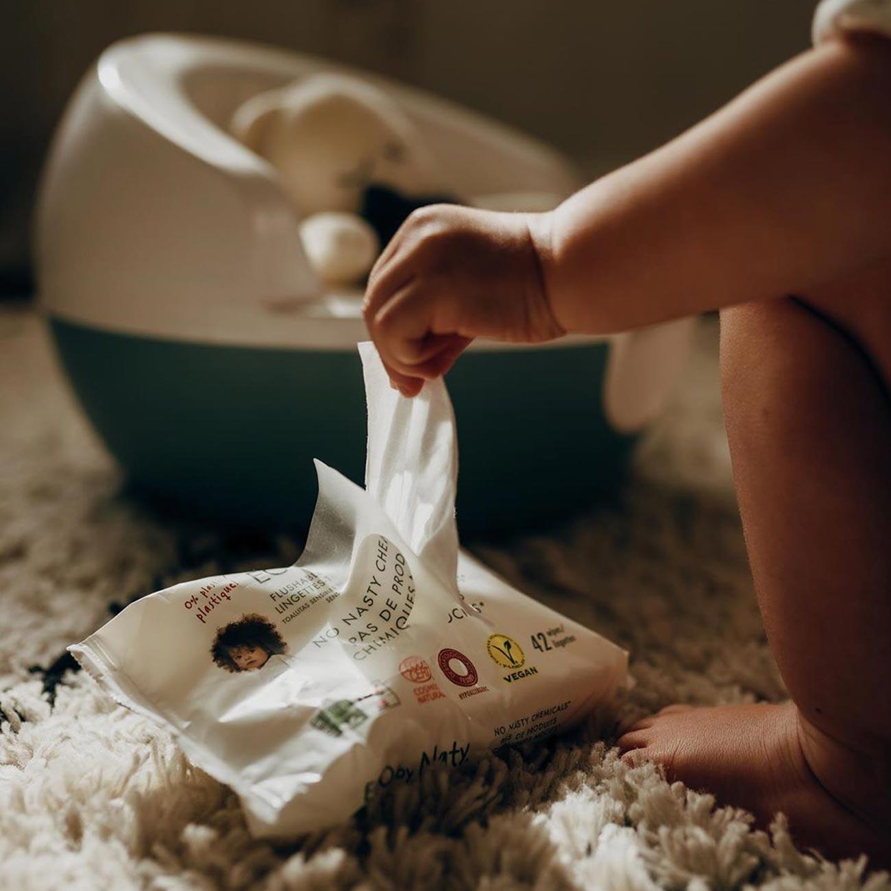 - Desechar la toallita en la basura (no tirar al inodoro).
