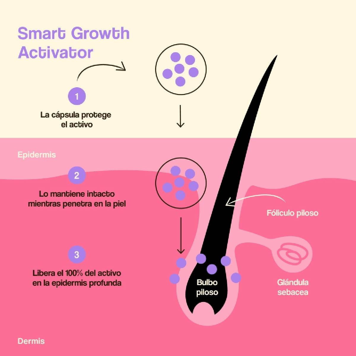 - Restaura el ciclo capilar alterado, para un crecimiento saludable y fuerte