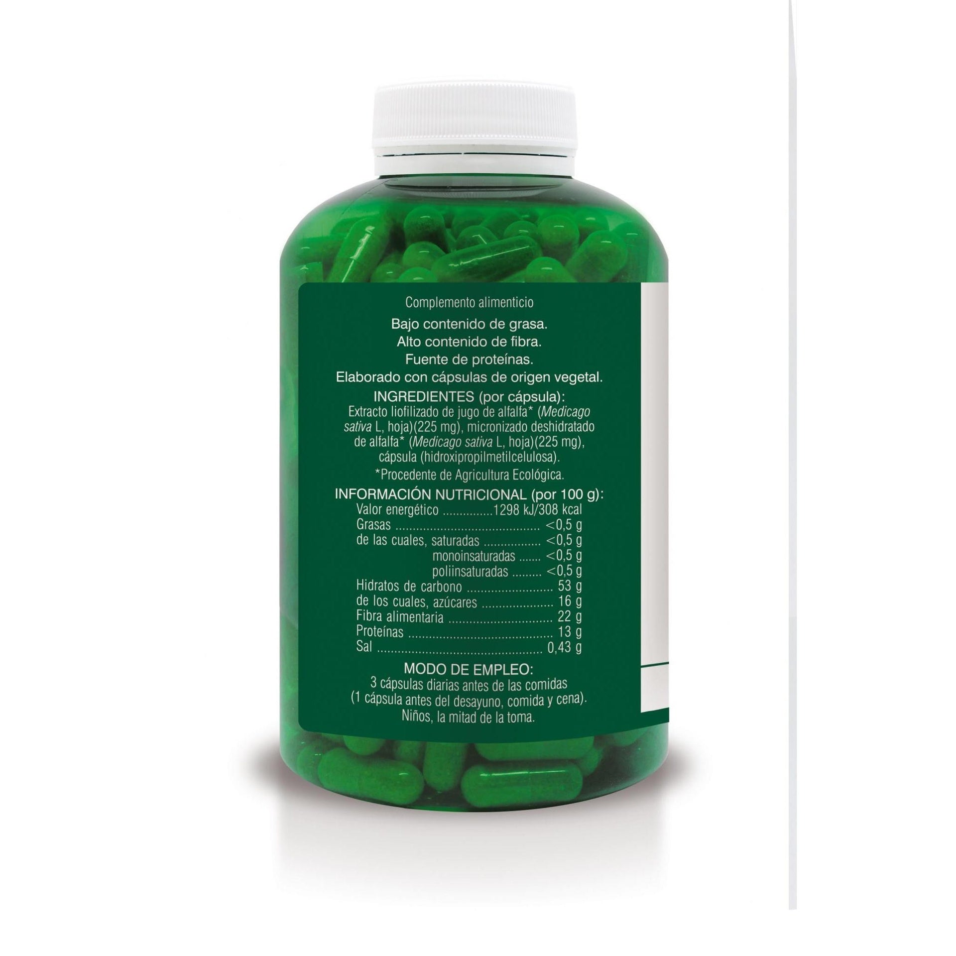 (por cápsula) Extracto liofilizado de jugo de alfalfa* (Medicago sativa L, hoja) (225 mg), micronizado deshidratado de alfalfa* (Medicago sativa L, hoja) (225 mg), cápsula (hidroxipropilmetilcelulosa).