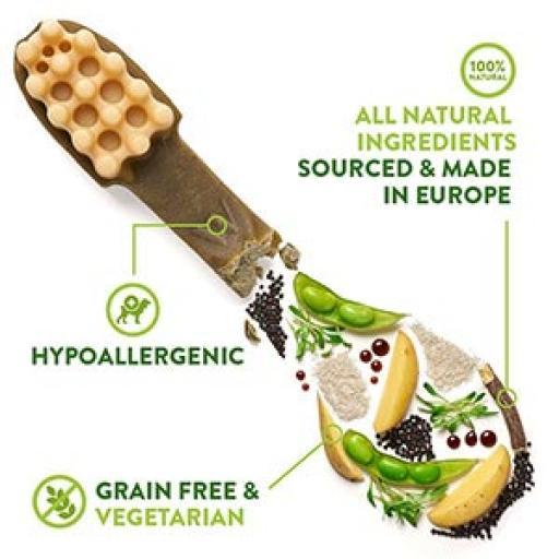 Whimzees snack dental utiliza para su receta ingredientes naturales y 100% vegetales. Su base incluye almidón de patata, que aporta energía a tu mejor amigo. También incluye glicerina, que hace que sea un snack muy sabroso, y extracto de malta, que mejora el metabolismo y tono muscular de tu perro, además de mantener sus huesos fuertes.