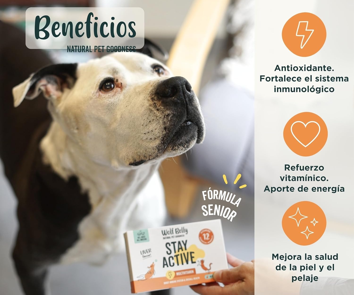 Toda la información sobre "Wolf Belly Stay Active Vitaminas para Perros Senior +8 años 30 comp"