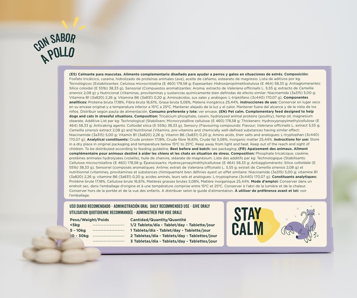 - 🎆 APOYO EN MOMENTOS DIFÍCILES: Stay Calm ayuda a tu perro o gato a mantenerse tranquilo durante tormentas, fuegos artificiales, viajes o visitas al veterinario. Su fórmula con L-triptófano, aceite de semillas de cáñamo, valeriana y té verde promueve el equilibrio emocional y el bienestar general, sin sedación ni efectos secundarios.