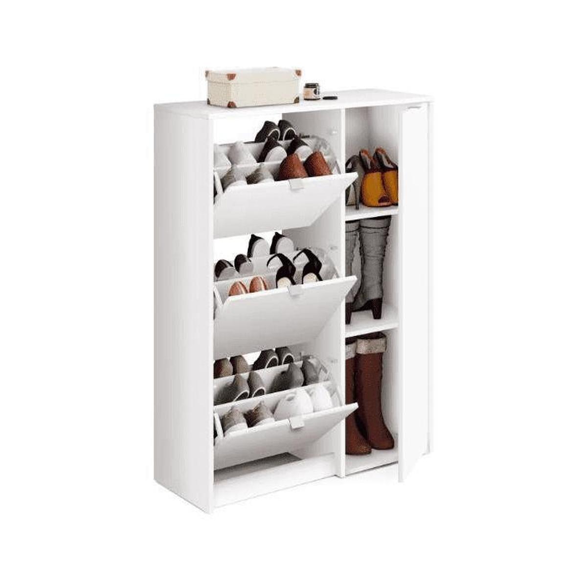 Zapatero Botero Trevi Cambrian. Práctico y bonito zapatero, con gran capacidad de almacenamiento de zapatos. Compuesto por tres compartimentos con puerta batiente, y un armario lateral con dos estantes regulables en altura, para almacenamiento de botas u otros objetos. Capacidad para 18 pares de zapatos, aproximadamente.